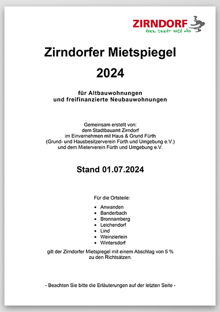 Der Mietspiegel Zirndorf zeigt eine statistische Übersicht der ortsüblichen Vergleichsmieten. Angemessene Mietpreise und Veränderungen auf dem Wohnungsmarkt werden berücksichtigt.