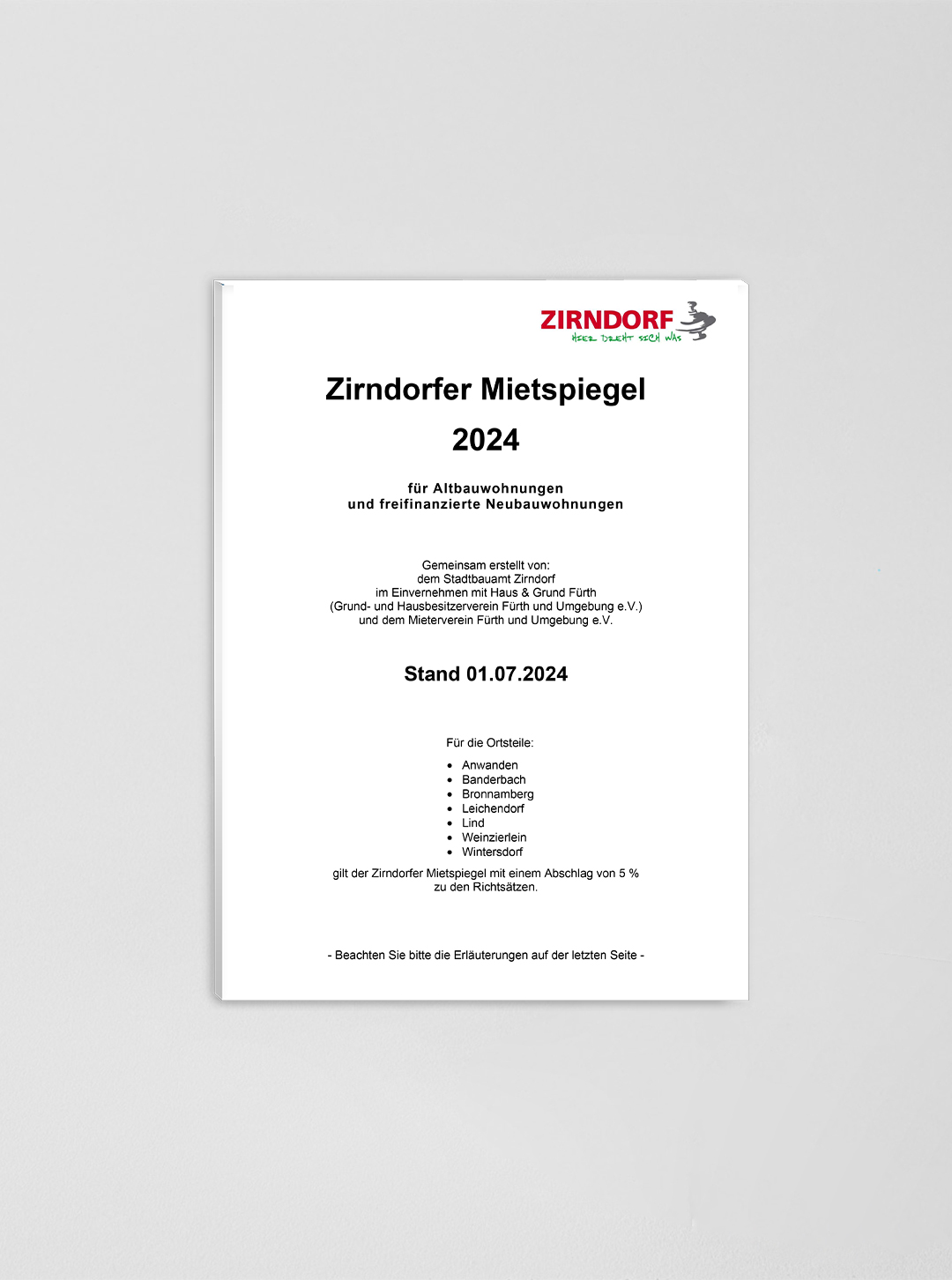 Der Mietspiegel Zirndorf zeigt eine statistische Übersicht der ortsüblichen Vergleichsmieten. Angemessene Mietpreise und Veränderungen auf dem Wohnungsmarkt werden berücksichtigt.