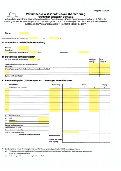 Exel-Tabelle zur erleichterten Berechnung der Wirtschaftlichkeit für öffentlich geförderten Wohnraum.